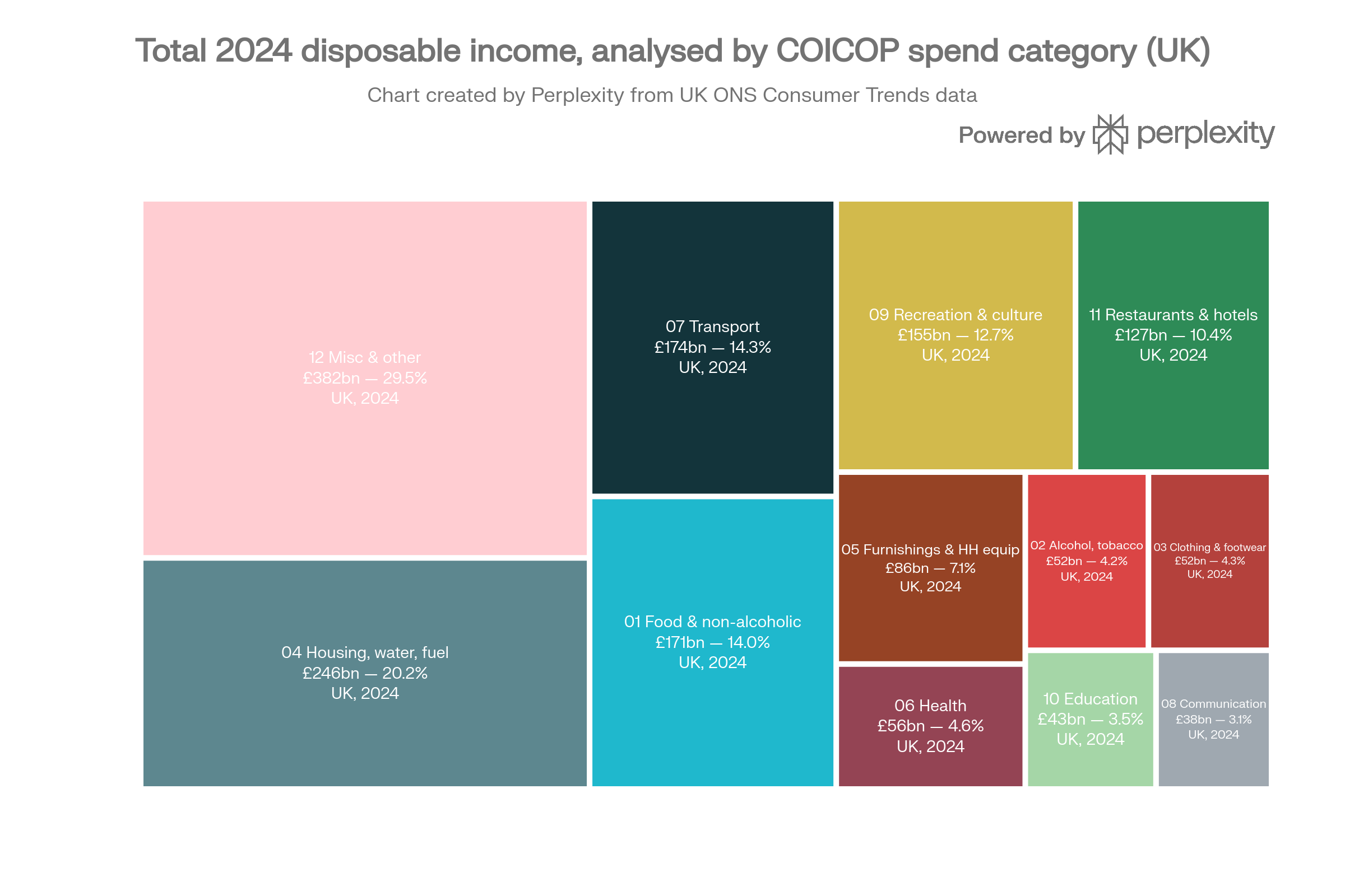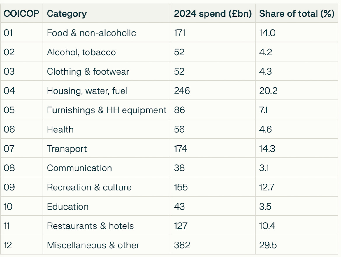 The approximate UK household expenditure split (by the UN-defined ‘Classification of Individual Consumption by Purpose’ or COIPOC, for 2024, citing total annual spend in £GBP, sourced from ONS is below - see footnote for fuller information):