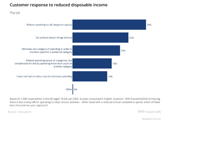 In not-yet-published research this week from RetailX, we asked customers how they would likely respond to reduced disposable income, and the flash results (below) show that after the initial reduction/elimination of spend, the option to reprioritise spend across categories was selected by 35% of respondents.
