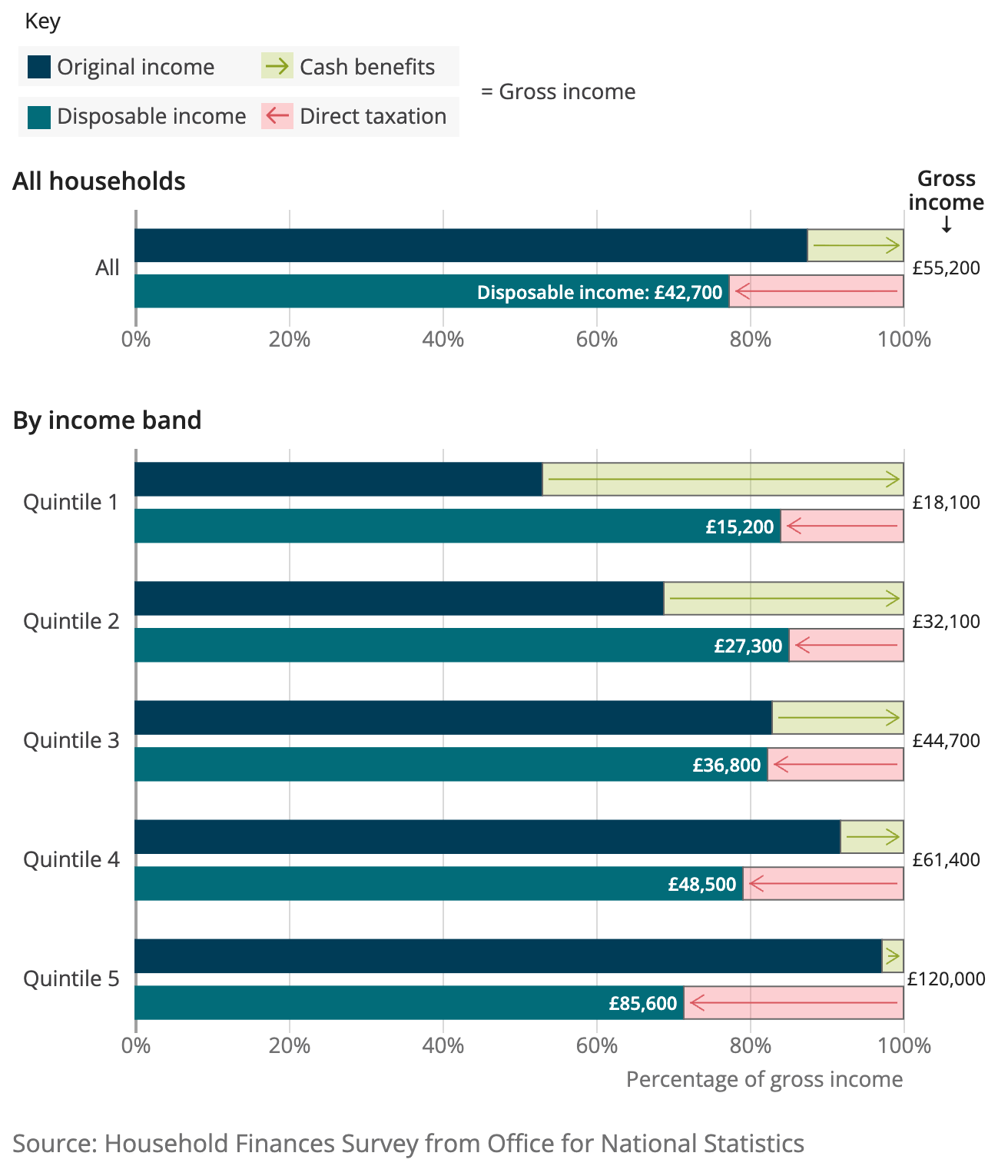 The UK uses the UN definition of spending, namely the “Classification of Individual Consumption by Purpose’, or COICOP. There are 12 categories (detailed here) and the following chart and table give the values for 2024 in the UK (£GBP). If you want European data there is an explorer option giving all countries to 2018. Back to the UK, here is the annual “disposal” income for FYE 2024, analysed further by income quintiles: